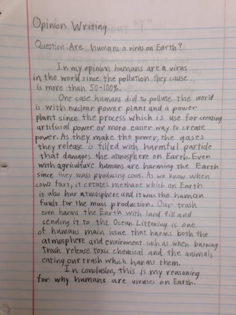 Opinion Writing: "Are humans a virus on Earth?" by Steven